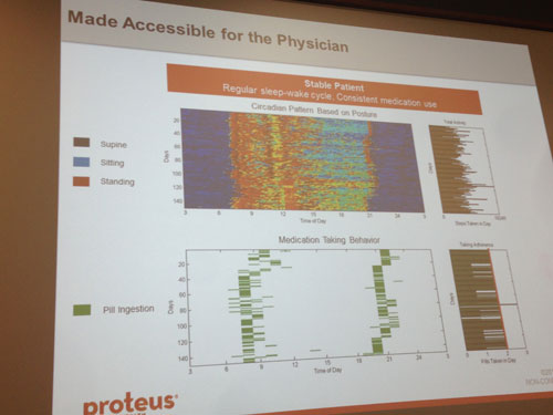 Proteus discussed the future release of an ingestible sensor that would integrate with medication allowing physicians to monitor compliance from a remote location. This is important for patients with diseases of the central nervous system (including multiple sclerosis, Huntington’s, schizophrenia, Parkinson’s and Alzheimer’s), heart failure and possibly organ transplant patients. This innovation would track sustained patient compliance and provide assurance that medications are being taken in a timely manner for presiding physicians or caregivers and family loved ones.